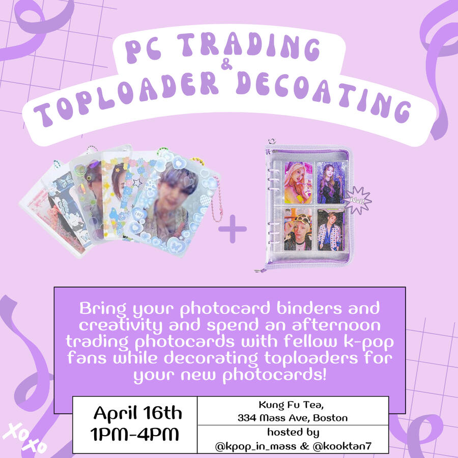 Purchase of a beverage from Kung Fu Tea is required in order to participate in our event. There is a $1 suggested donation to decorate a toploader to help us fundraise for our upcoming cupsleeve events.How does photocard trading work?